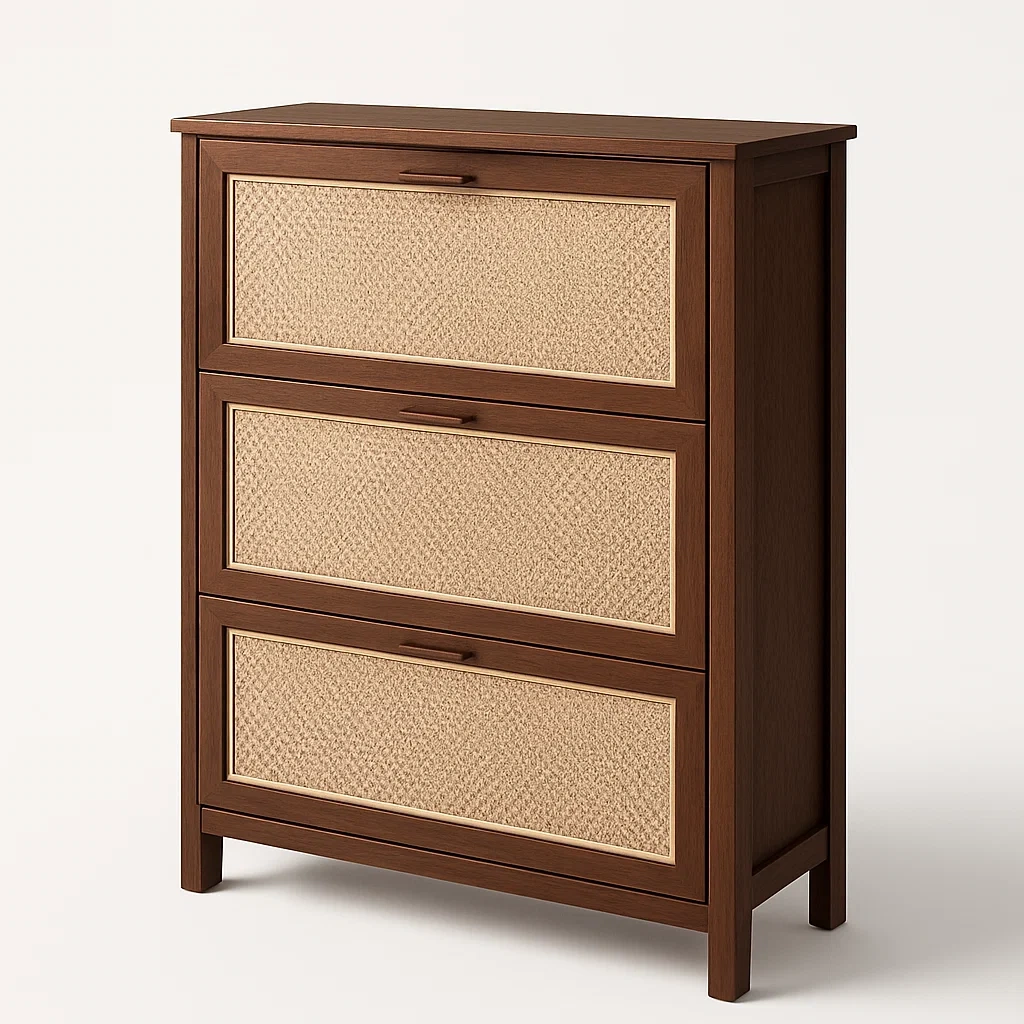 Materiales: Estructura de madera maciza, frente de cajones de ratán.